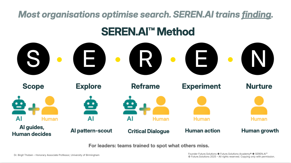 SEREN.AI structures human–AI collaboration into five deliberate phases: Scope, Explore, Reframe, Experiment, Nurture.